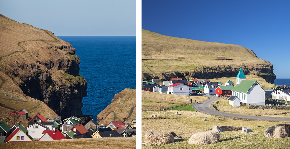 Gjogv ist zwar ein Touristen Hotspot aber wirklich sehenswert. Nette Häuser, eine schöne Kirche, eine tolle Hafenschlucht und viele Schafe.