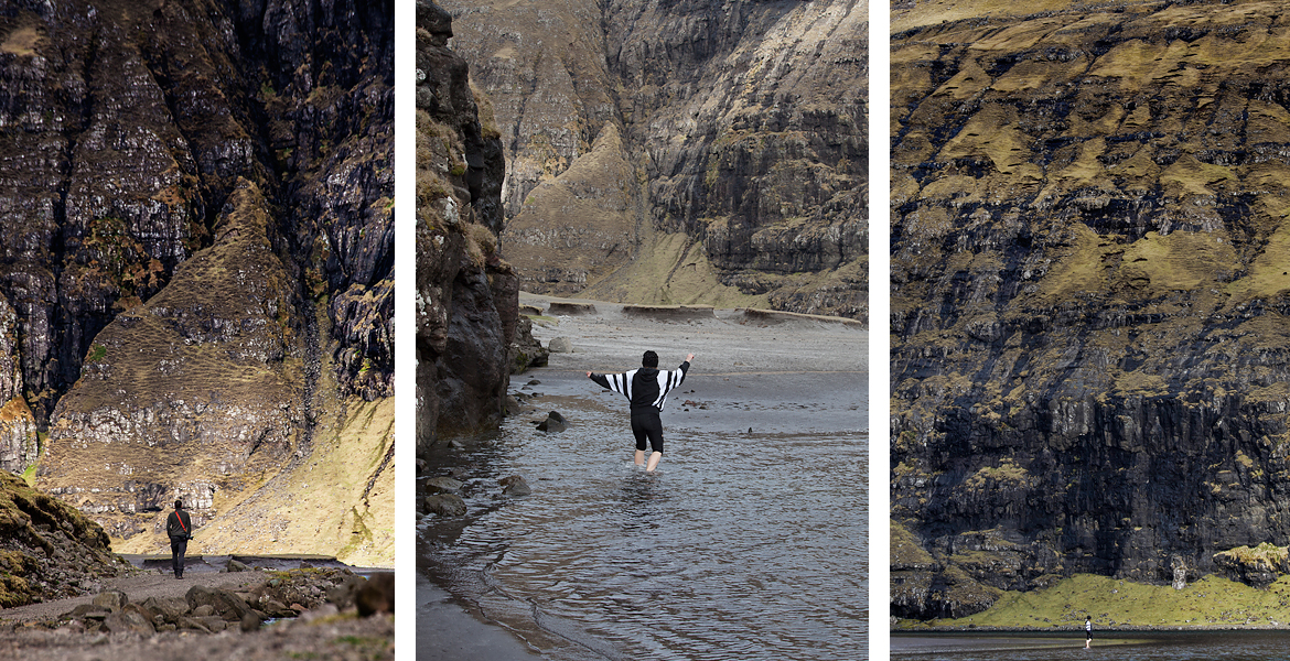 Von Tjornuvik ging es die Straße wieder zurück und weiter nach Saksun. Wir sind zunächst ein Stück zum Wasser runtergelaufen. Ich zog mir die Schuhe aus um auf eine kleine Sandbank zu gelangen, die Berge drum rum waren einfach episch. Auf den Fotos kann man die tolle Landschaft und ihre Größe nur erahnen.