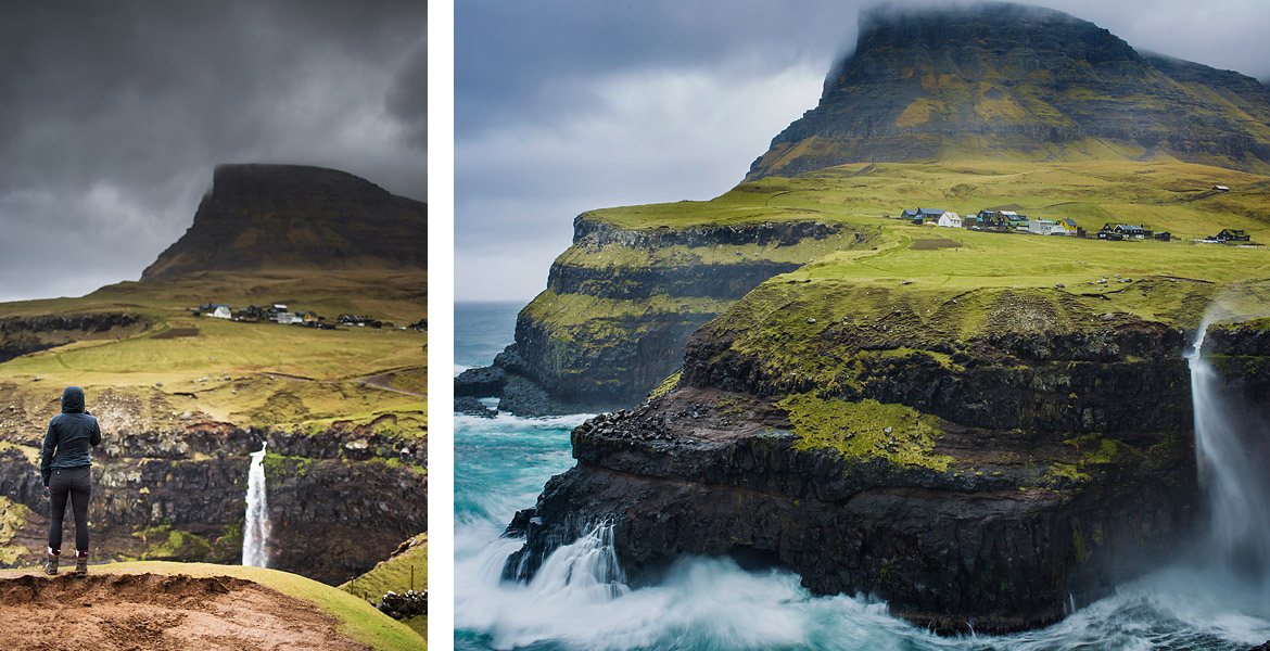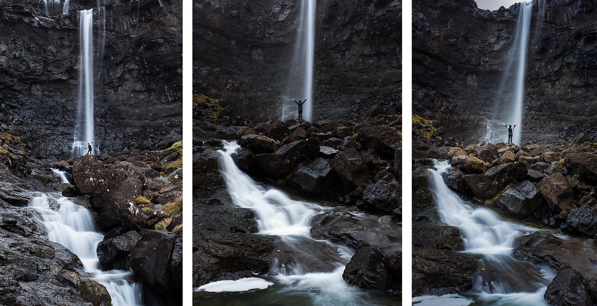 Obwohl die Fähre erst in 2,5 Stunden kommen sollte, war die Schlange schon ziemlich lang. Hinter uns im LKW wurde geschlafen und wir sind auch locker für eine Stunde im Auto eingedöst. Die Fahrt mit der Fähre war etwas schaukelig. Im Supermarkt noch was zu essen gekauft und zurück zur Unterkunft. Abends sind wir zum Fossa gefahren und haben tolle Fotos gemacht. Der Fossa ist einer der höchsten Wasserfälle der Färöer, er fällt über zwei Etagen 140 Meter tief ins Meer. Zum Zeitpunkt der Fotos führte er nicht viel Wasser, bei Regen ist er noch viel spektakulärer. Ich liebe die Fotos aber trotzdem!