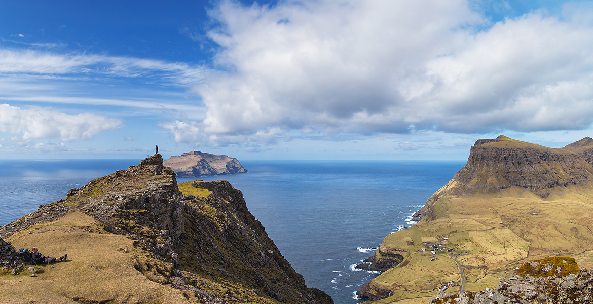 So toll Drohnenbilder auch sind, ich mag sie, aber nervig sind die Teile. Oben war noch eine Gruppe mit ihrer Drohne im Gange. Echt laut. Zum Glück waren die bald weg und man konnte in Ruhe die Aussicht genießen. Oben auf dem Berg haben wir uns noch dazu entschlossen zum Tindholmur zu wandern. Der Tag hatte noch ein paar Stunden über.